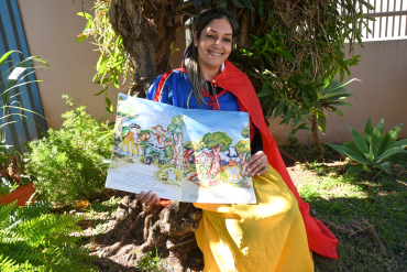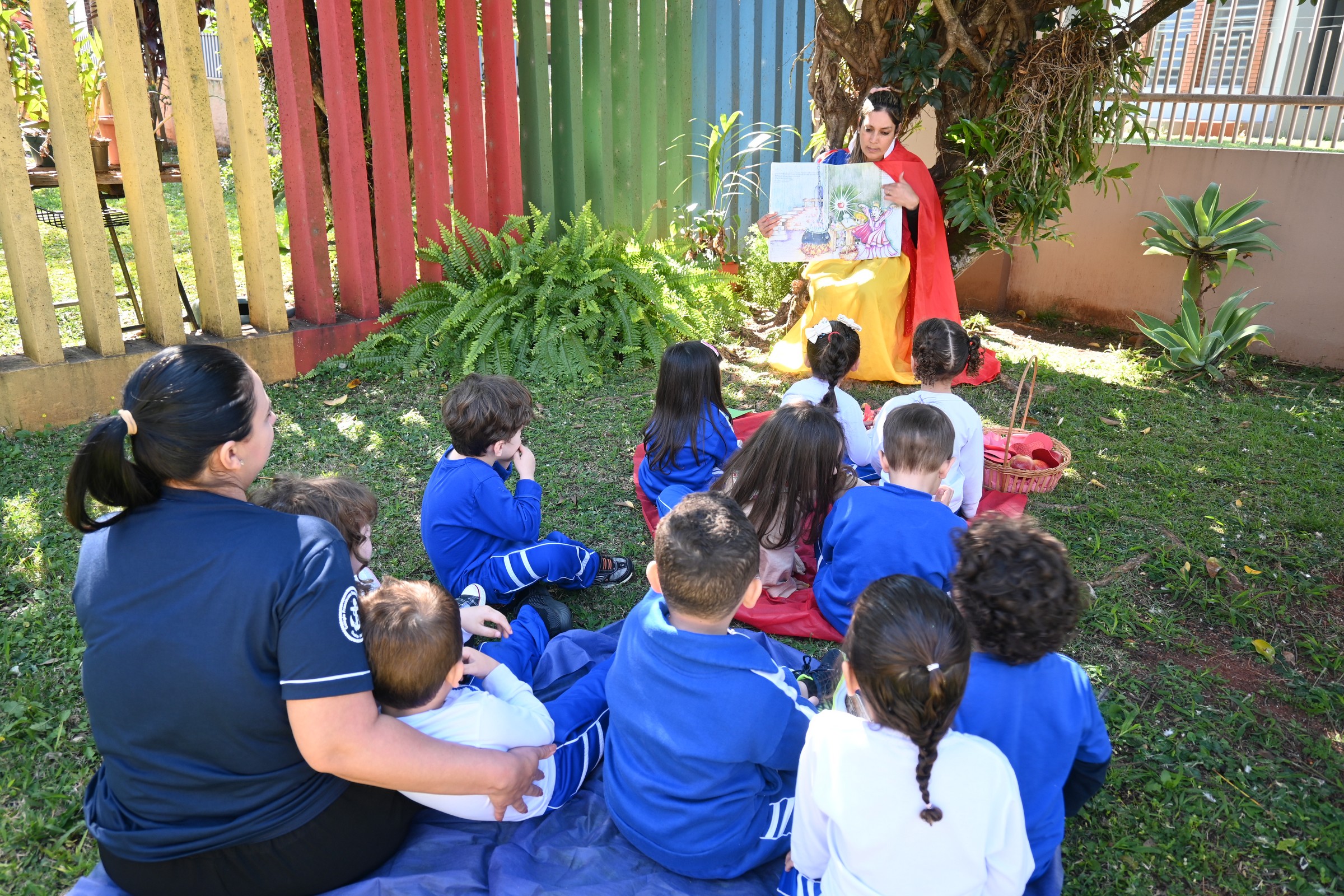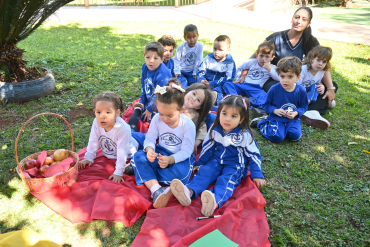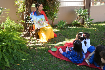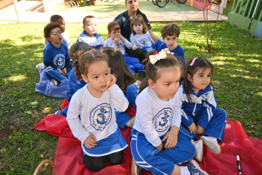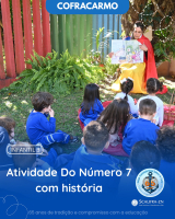 Para apresentar o número 7, a professora Cleide e a monitora Aline encantaram os alunos do Infantil 3-1 com a história da Branca de Neve e os Sete Anões.