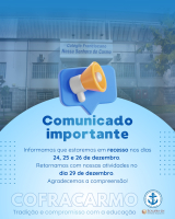 Informamos que estaremos em recesso nos dias 24, 25 e 26 de dezembro.