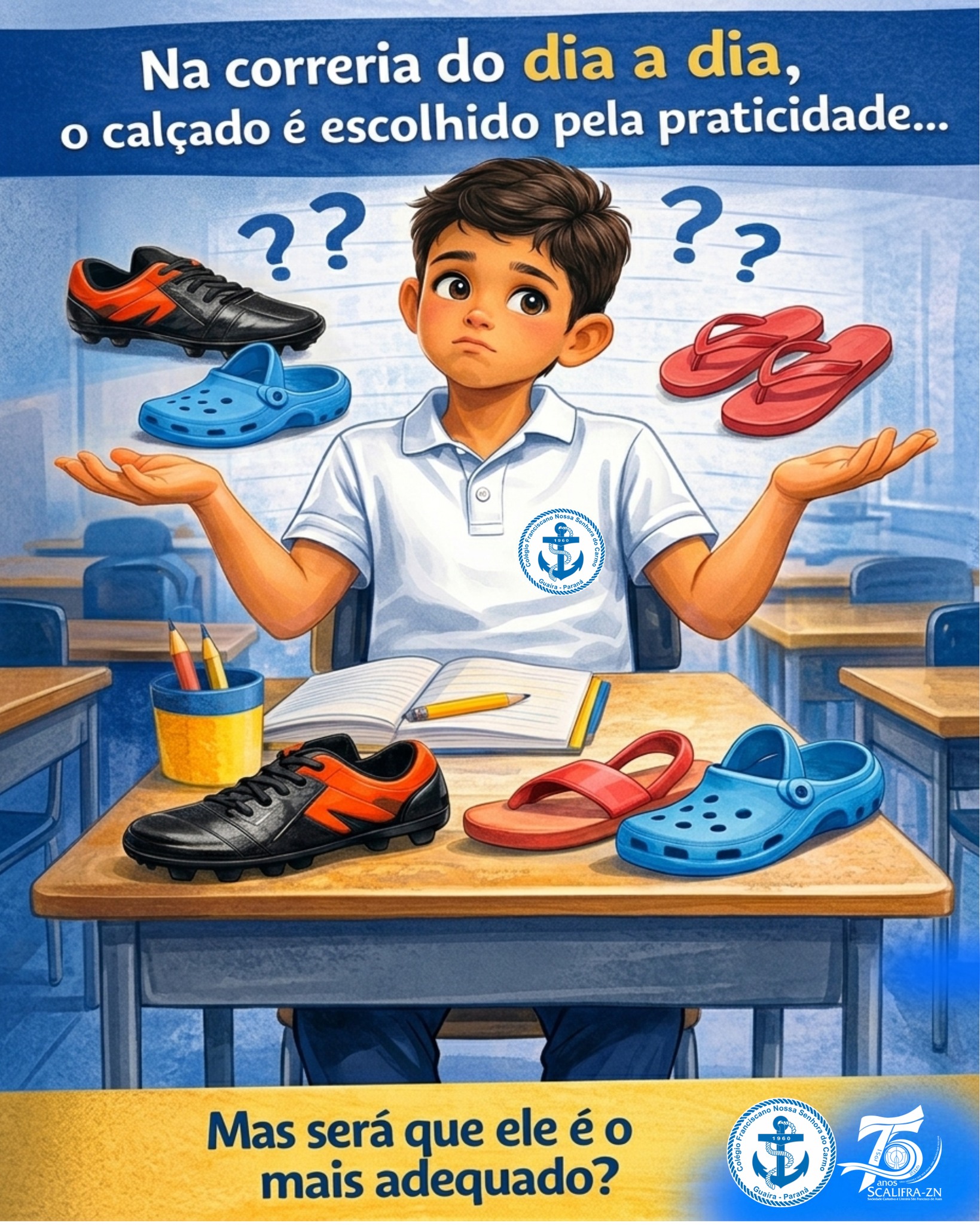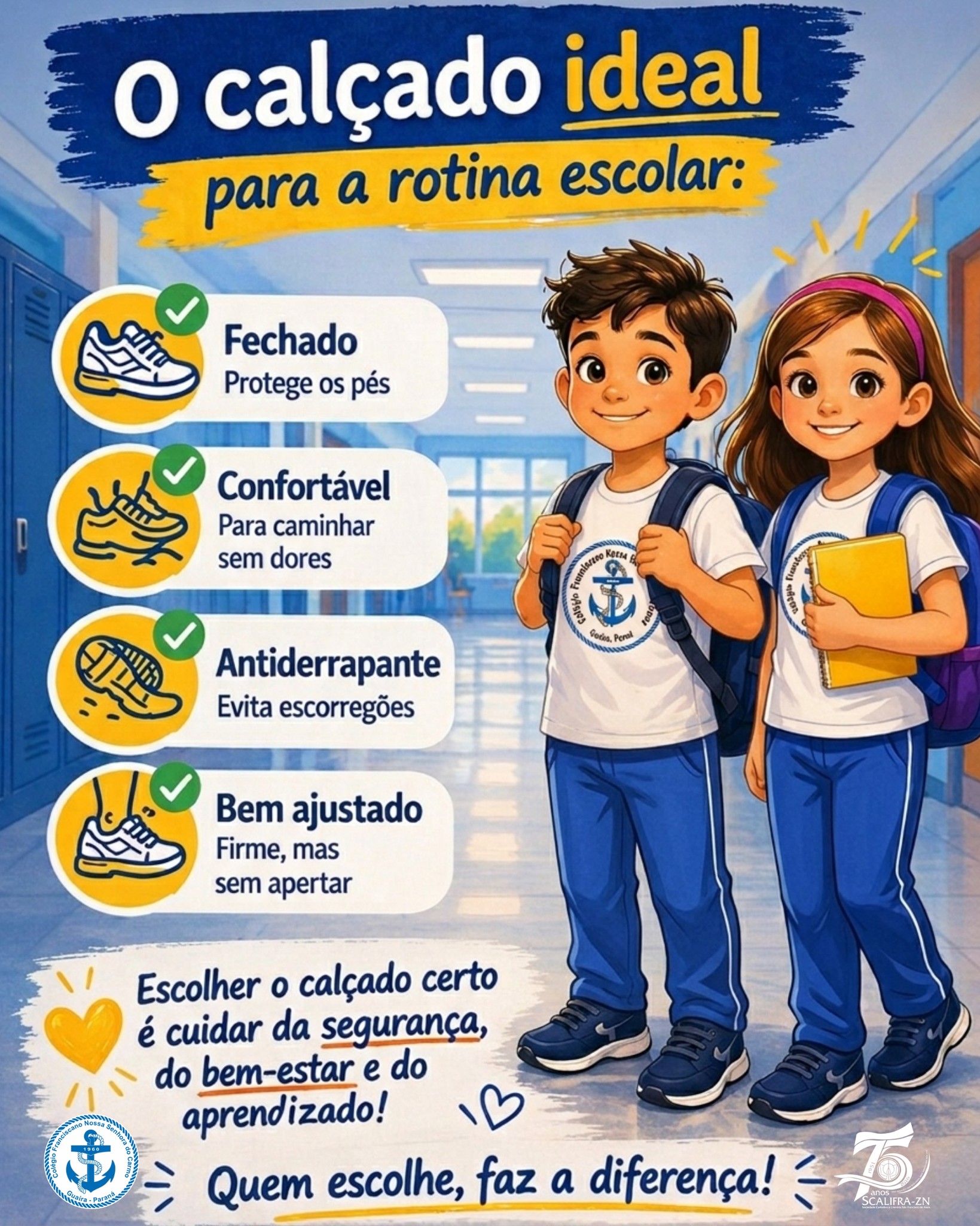 No Colégio Franciscano Nossa Senhora do Carmo, cada detalhe da rotina escolar é pensado para o bem-estar dos nossos alunos. E quando o assunto é o calçado ideal, a escolha vai muito além da estética: é uma questão de segurança e saúde.