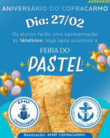 Os alunos farão uma apresentação às 16h45min, no pátio do colégio, logo após acontecerá a FEIRA DO PASTEL, realizada pela APMF do COFRACARMO.